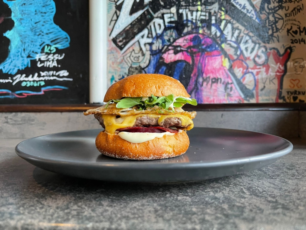 Finnish Aura Blue Cheese, Arugula, Beef patty, Pickled red onion, House Ketchup