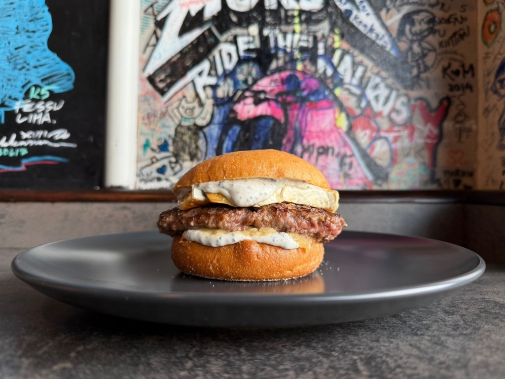 Finnish Aura Blue Cheese, Arugula, Beef patty, Pickled red onion, House Ketchup